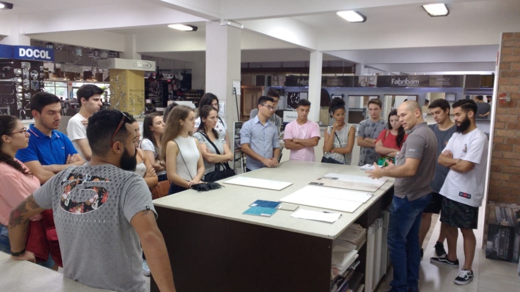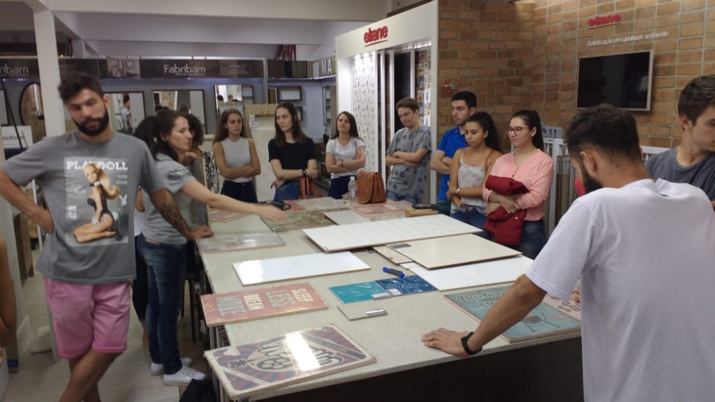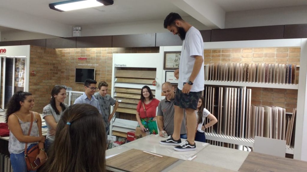 No último sábado (13), os acadêmicos da 3ª e 6ª fases do curso de Arquitetura e Urbanismo, tiveram uma aula diferente na disciplina de Materiais de Construção, ministrada pelo professor Humberto Almansa Carvalho. Os acadêmicos foram até o município de Cocal do Sul visitar a empresa Guollo Materiais de Construção. Lá foram recebidos pelo supervisor do de cerâmicas da loja, Rogério Tuxen, que apresentou assuntos técnicos, como compreender as características e diferenças entre as classes de material, resistência ao risco e ao impacto quando for deixado cair um pedaço de cerâmica sobre o porcelanato, além de atividades lúdicas com desenhos para mostrar a dificuldade que o cliente tem em explicar o que ele deseja projetar. Por fim, foi realizado um bate-papo sobre tendências de mercado.
