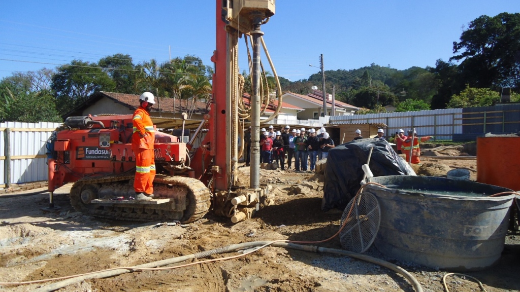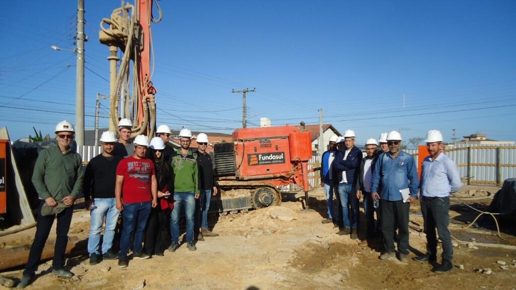 Os alunos foram recepcionados, pelo Sr. Dirley Delt (proprietário da Construtora) e pelo Engº. Amarildo Zamparetti da FUNDASUL, empresa responsável pela execução das fundações. Na ocasião, o Eng. Amarildo destacou a importância das investigações geotécnicas e apresentou in loco as etapas executivas (perfuração, instalação da armação e injeção de argamassa) bem como as possíveis interferências e suas soluções na execução das fundações tipo “estaca raiz”.